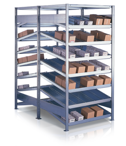 Stored Goods such as Cartons Slide down Automatically to the Take-Out Side at a 14" angle.